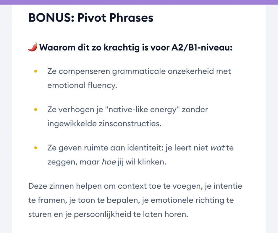 "Ik wist niet goed wanneer en hoe deze uitdrukkingen te gebruiken. Het voelde als iets zo cultureels, zo Spaans, dat ik het voor mij zelf niet legitiem vond om het te gebruiken. Nu ik niet meer twijfel over het hoe en wanneer, en ik weet dat dit de sleutel is, begint Spaans spreken pas echt als een spel te voelen!"